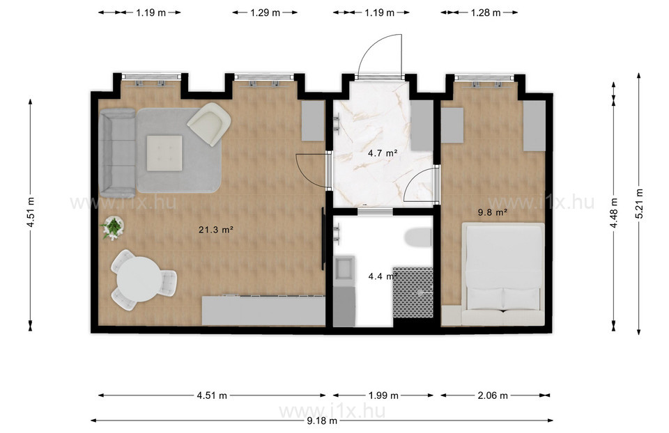 Szobák: nappali + háló