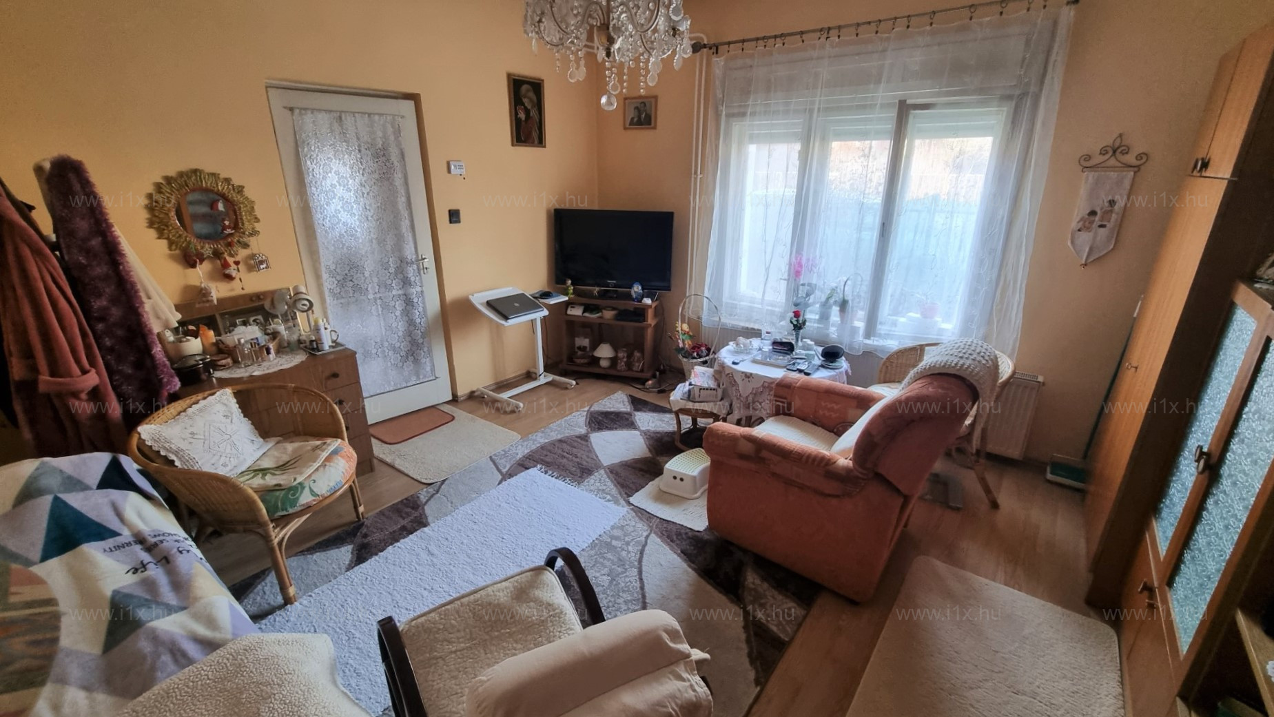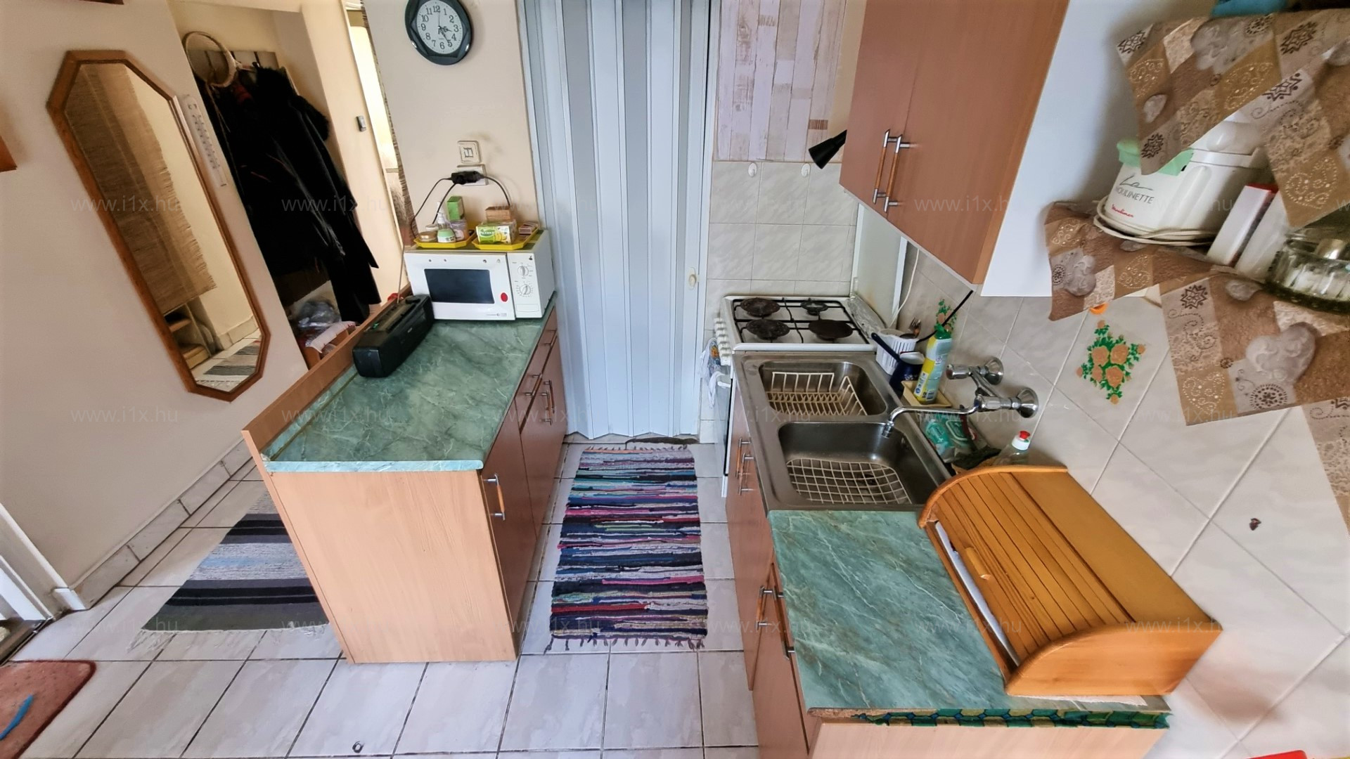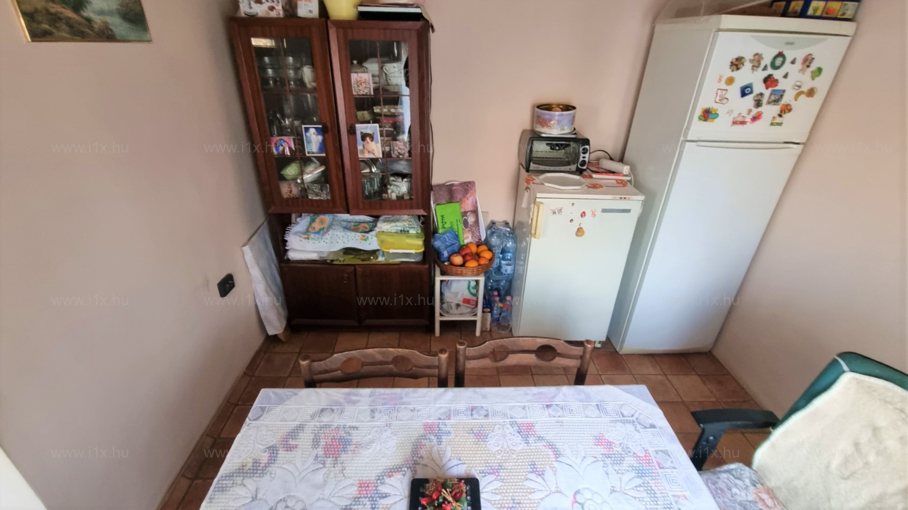 Az ingatlanba az utcáról előkerten keresztül külön bejáraton jutunk be, ahonnan az előtérrel egybenyitott konyhába érkezünk. Jobbra található a félszoba, amit jelenleg étkezőnek használnak.