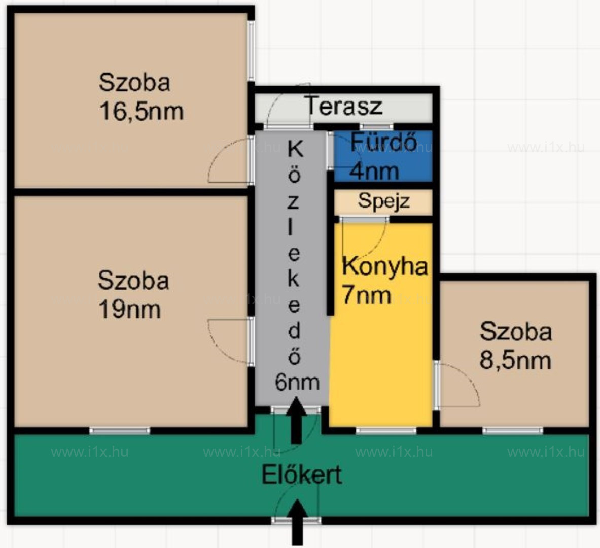 Balra fordulva érkezünk meg a nappaliba a folyosón továbbhaladva pedig a másik nagyszobába, mellyel szemben a kádas fürdőszoba helyezkedik el. A folyosó végén található a kijárat a hátsó teraszhoz (9 nm), a kertrészhez (25 nm).és a fészerhez (7 nm).