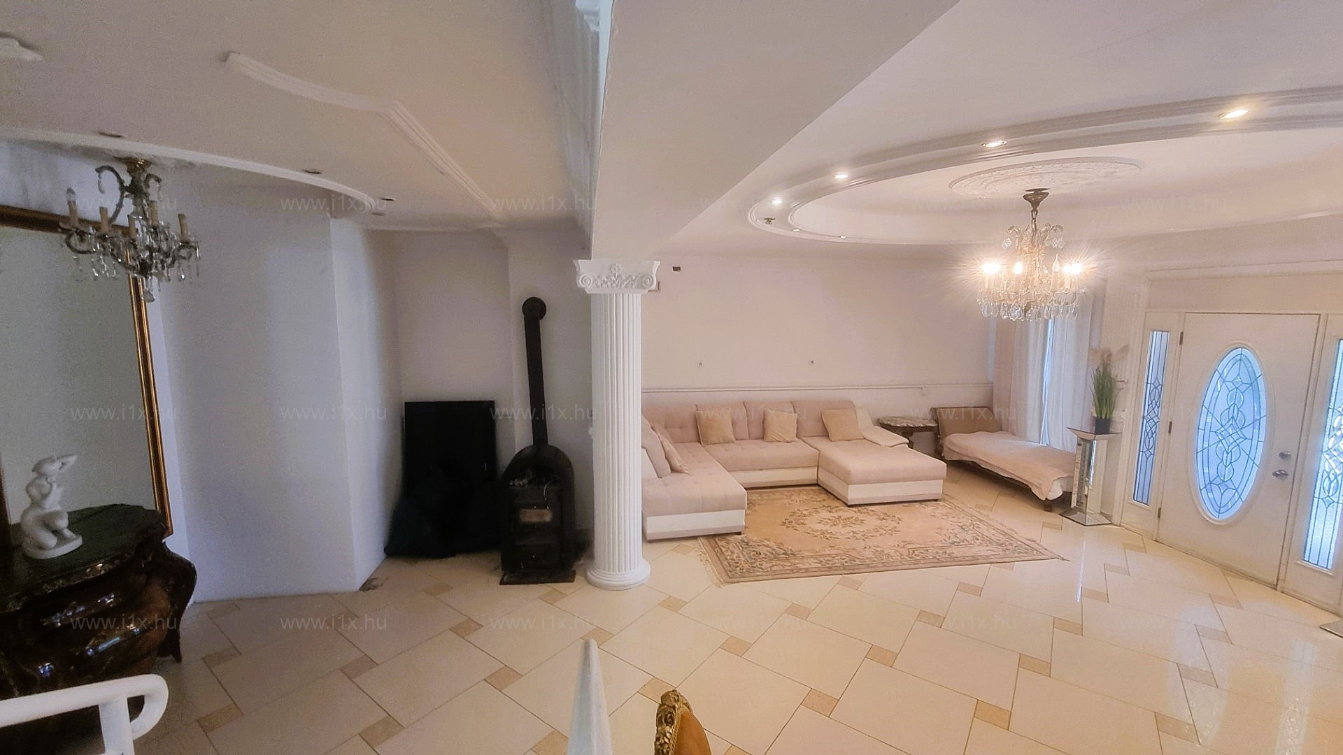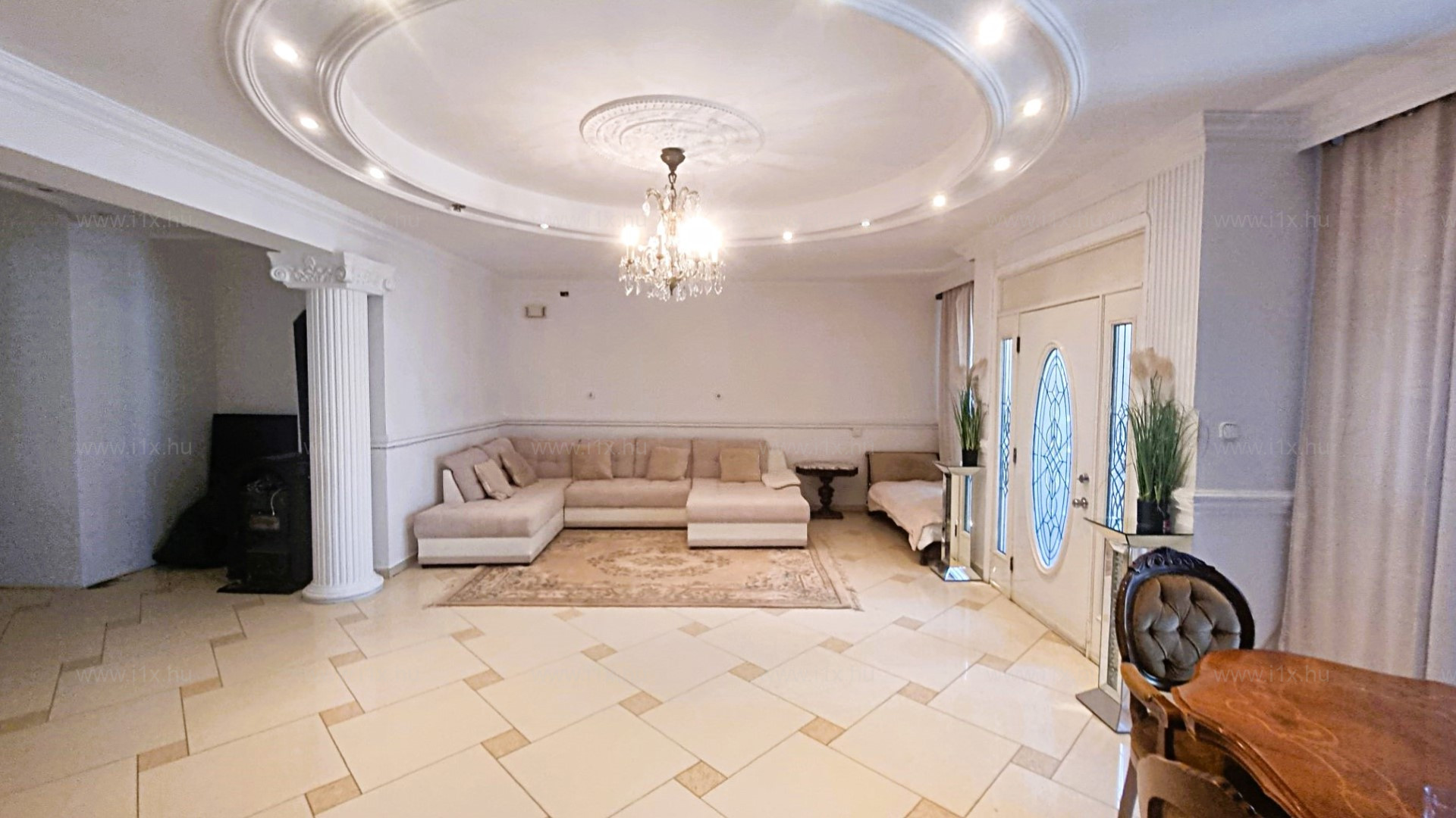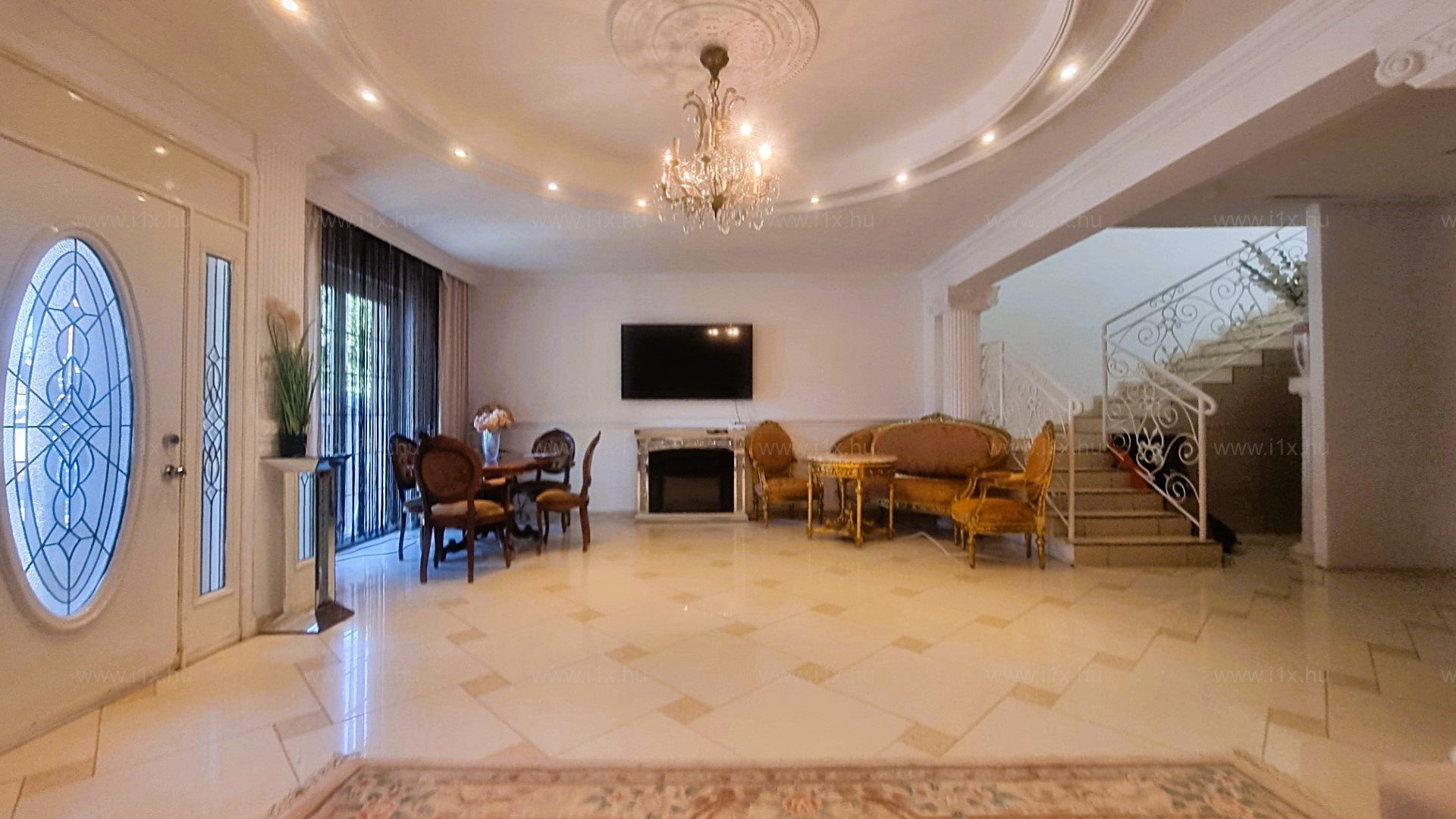 Az ingatlanba lépve egy hatalmas, világos nappaliba jutunk. Itt kapott helyet az étkező és ezen a szinten található még egy tároló helyiség és a lépcső.